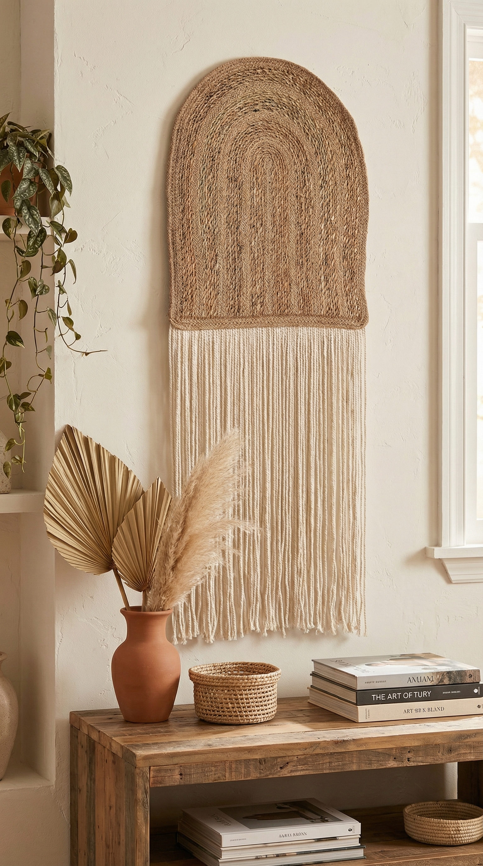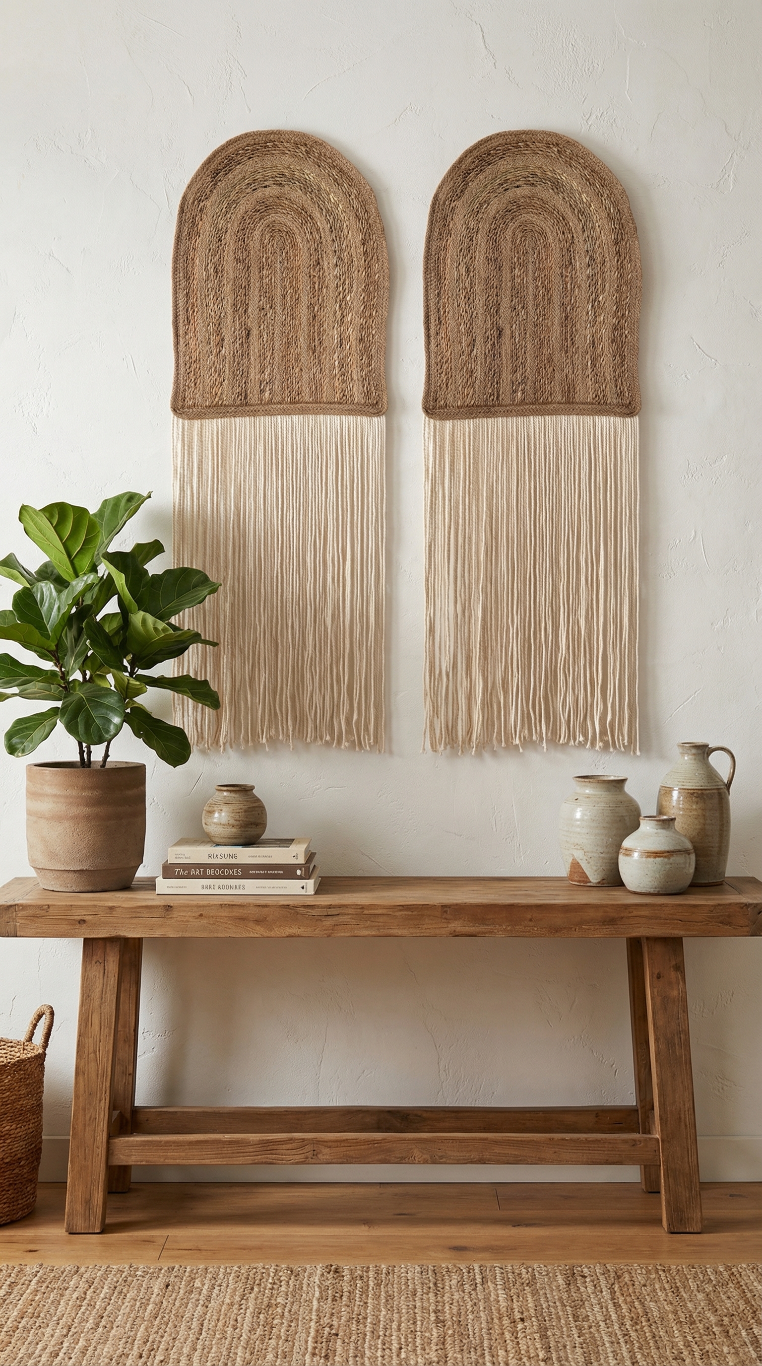 eseri. Doğal jüt dokusunun toprak tonlarındaki sıcaklığı, uçuşan beyaz